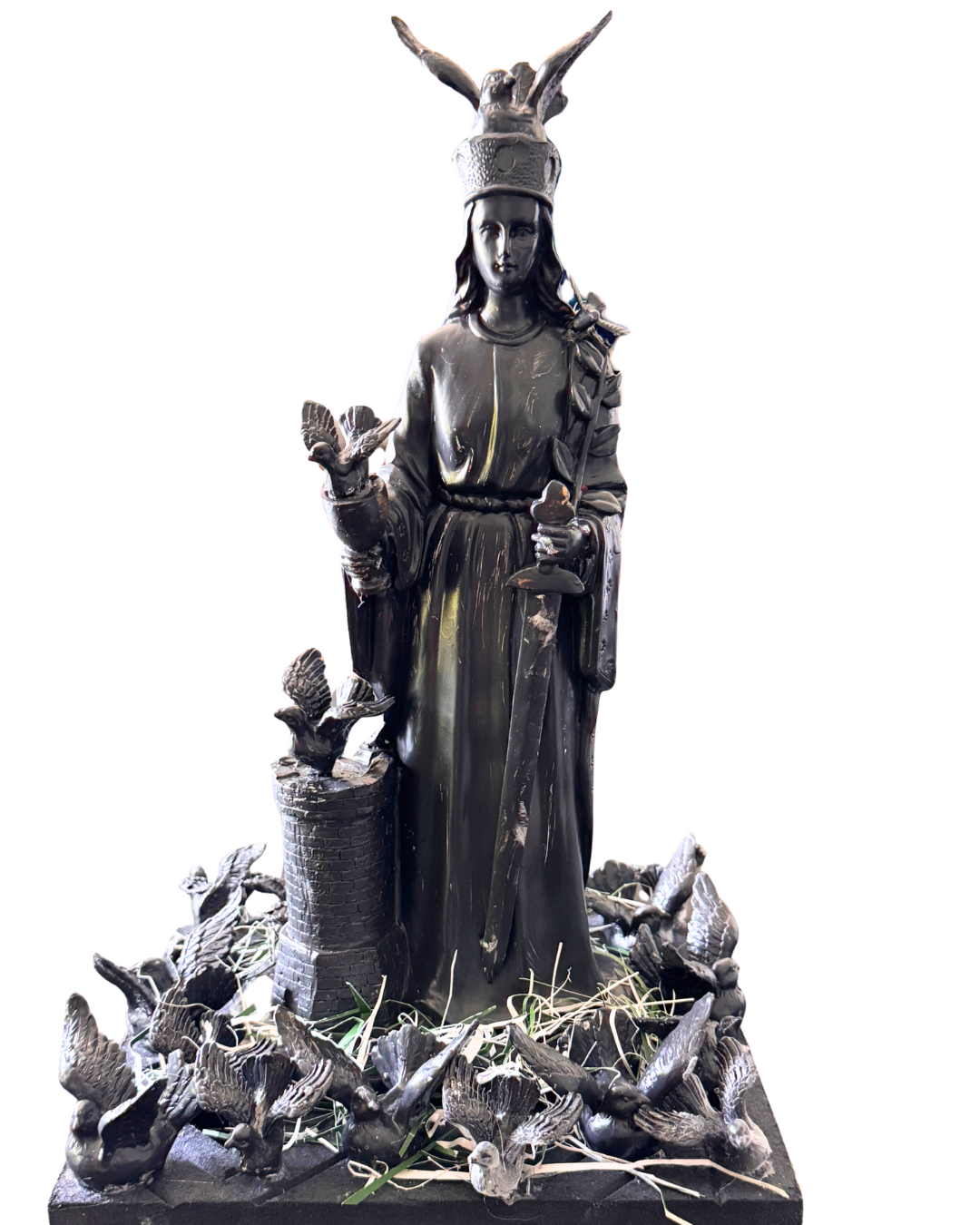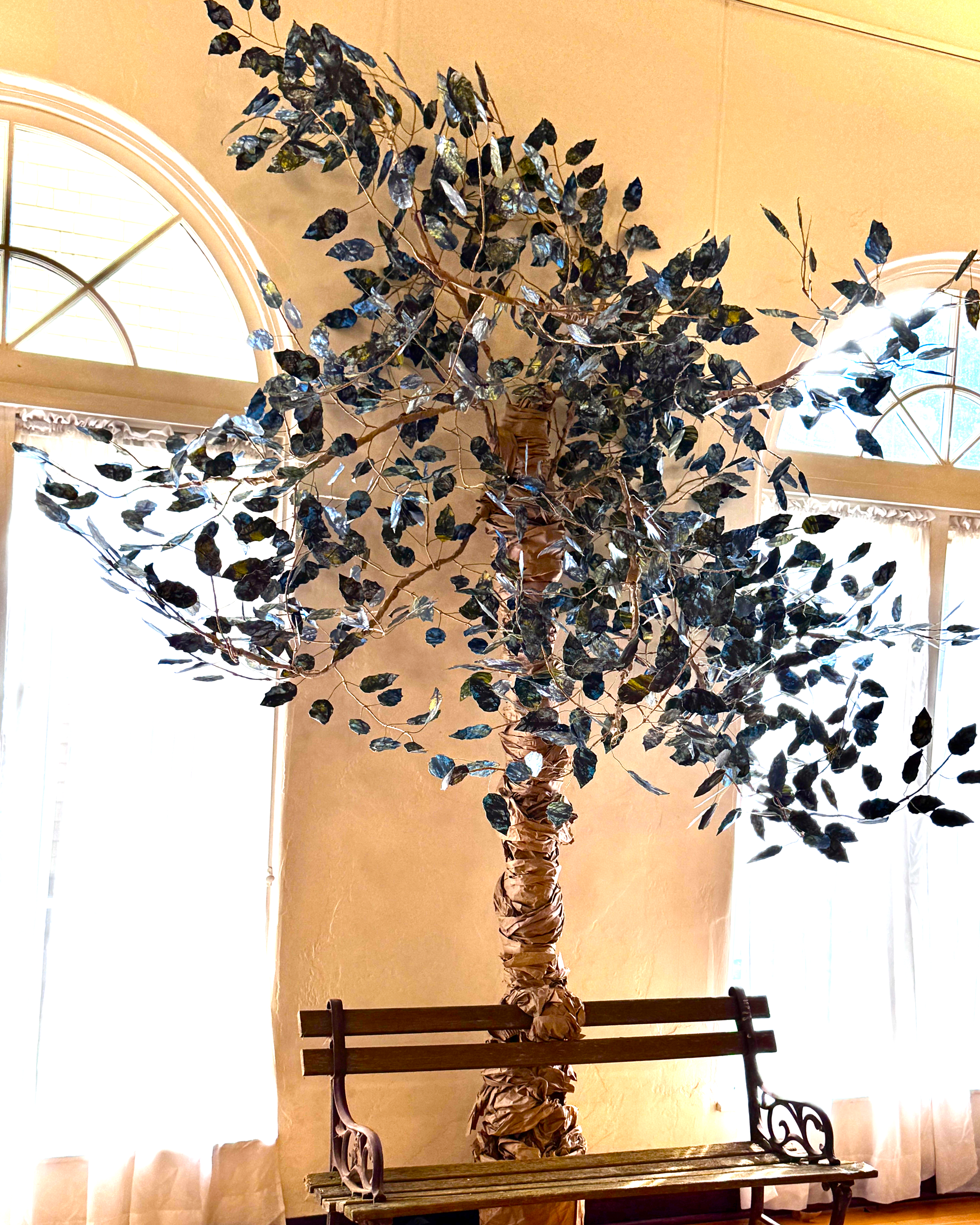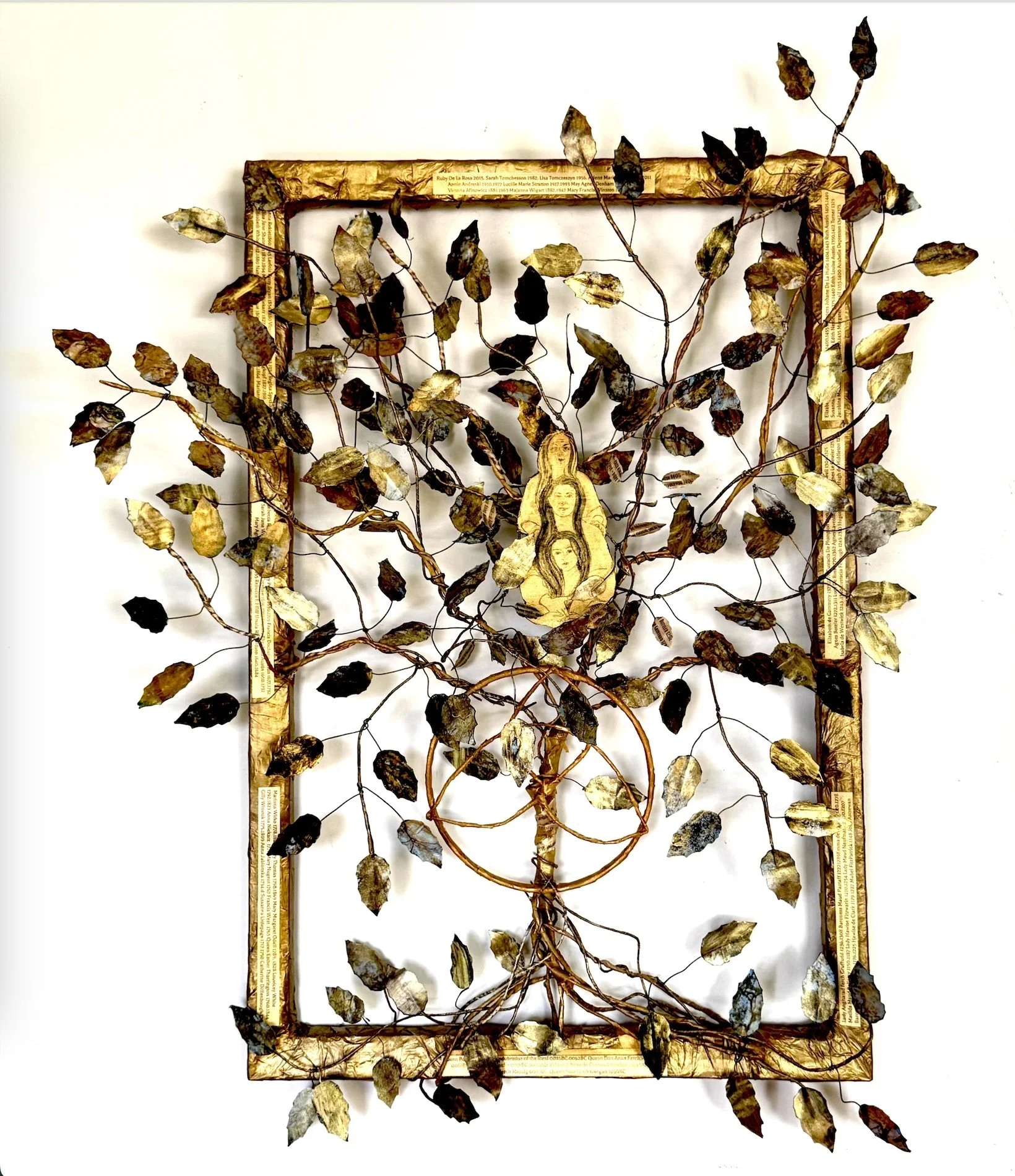 “The Morrigan” 17” x 10” x 10” Repurposed figurines and recycled materials. “Every Tree Deserves a Bench” 8’ x 8’ x8’Repurposed paper, and wire, leaves laser cut from photographs of the Oak Grove in Descanso Gardens. “Matrilineal Ascendancy”32” x 38”Repuposed paper, wire, and fiber